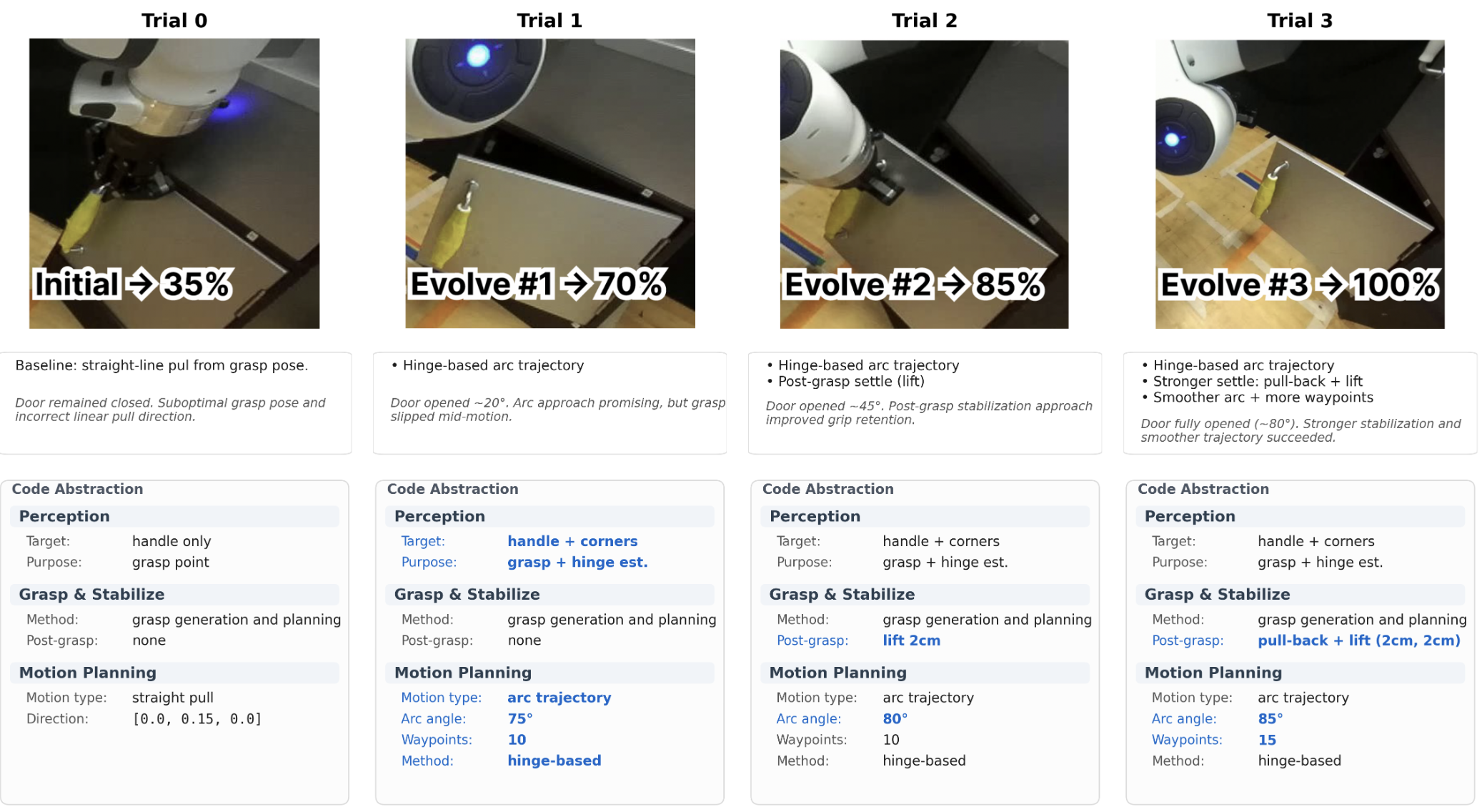We demonstrate this on the open-cabinet task. In the initial trial, Maestro attempts a top-down grasp with a straight-line pull ā failing to account for the door's hinge kinematics (35% progress). After reflecting on the video, it restructures its strategy entirely: estimating the hinge axis from door corner keypoints and generating a hinge-based arc trajectory, bringing progress to 70%. Subsequent evolutions introduce post-grasp stabilization to prevent handle slip (85%) and further refine the trajectory smoothness with more waypoints and incremental orientation tracking, ultimately achieving full task completion (100%). Across four autonomous trials, Maestro progresses from a naive linear pull to a kinematically grounded arc policy with robust grasp stabilization ā all through video-grounded self-reflection.