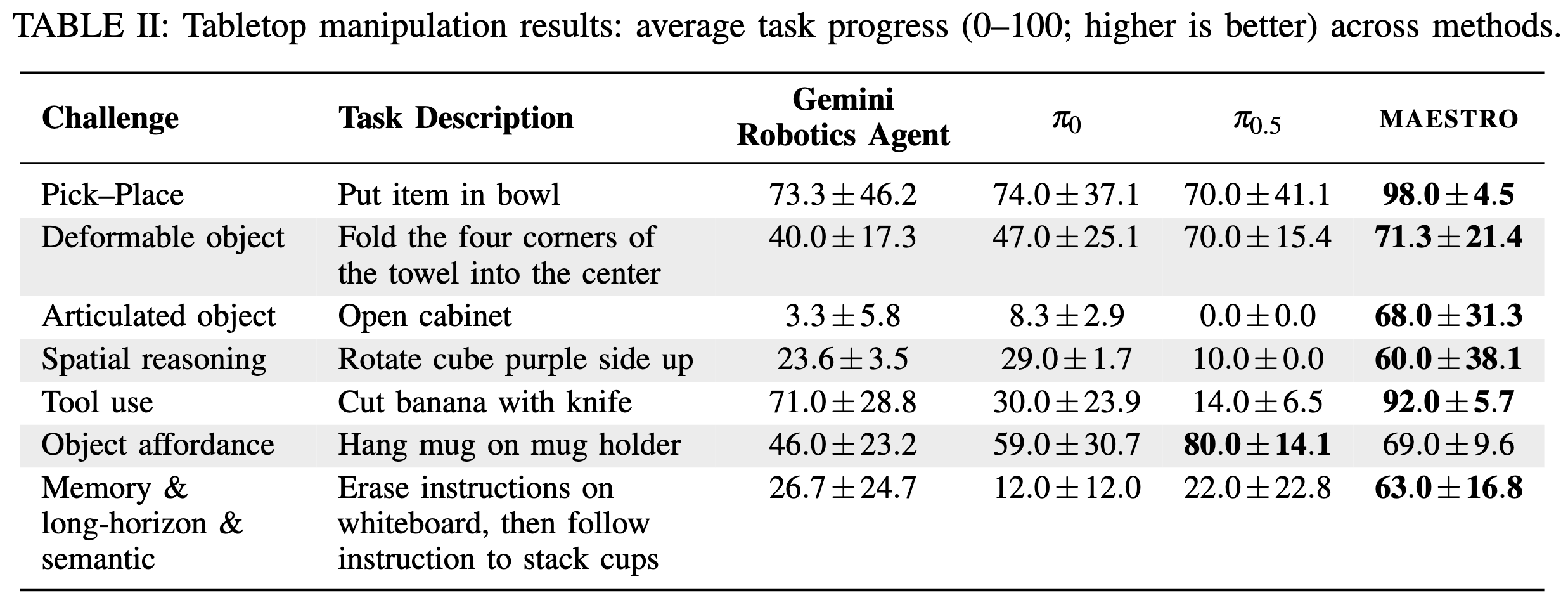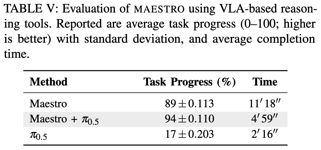 Maestro achieves improved efficiency and performance through the integrated use of a VLM and VLA tool module. The VLM leverages its sophisticated reasoning capability to interpret complex user instructions and provide detailed, accurate observational reasoning. The VLA functions as a fast and powerful "muscle," quickly completing simple, well-trained subtasks such as pick and place. This strategic division of labor allows the Maestro+VLA system to execute complex commands both quickly and accurately.