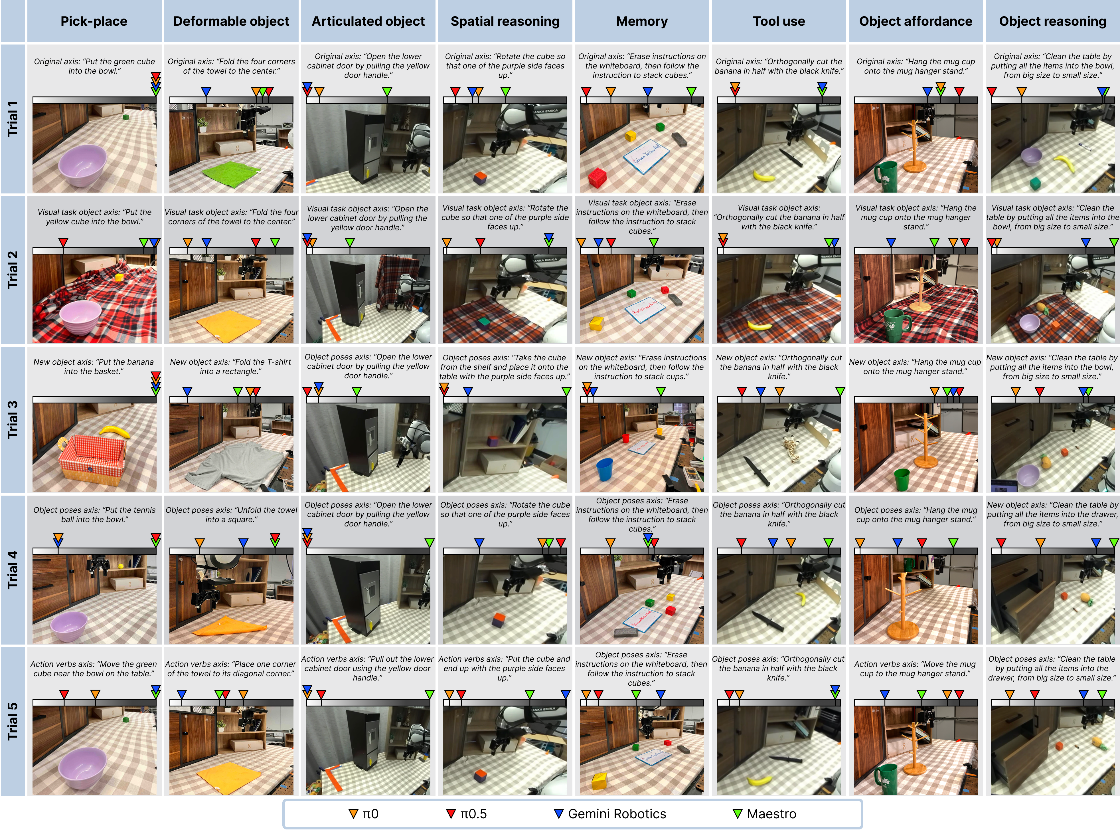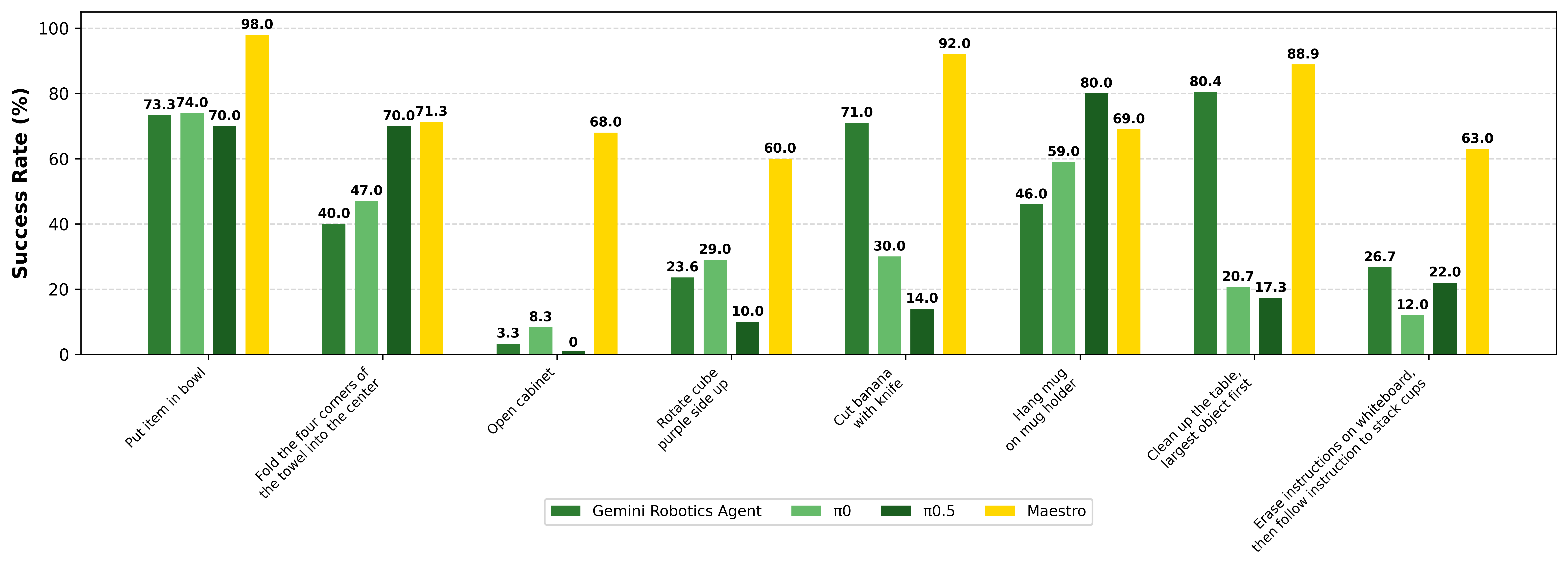 Our evaluation protocol is designed for systematic experimentation, adopting the STAR-Gen taxonomy of generalization for robot manipulation. STAR-Gen formalizes testing by creating systematic perturbations relative to a base task. We leverage the STAR-Gen scenario generation tool, prompting Gemini to generate diverse task instances across four key axes: visual changes to task-relevant objects, changes to object poses, changes to action verbs requiring new behavior, and introducing entirely new manipulated objects, This approach ensures that every trial differs substantially and meaningfully from the rest, capturing realistic in-the-wild diversity and providing a rigorous test of Maestro's robustness and adaptability. The table below presents the experimental setup and results comparison for each task trial.