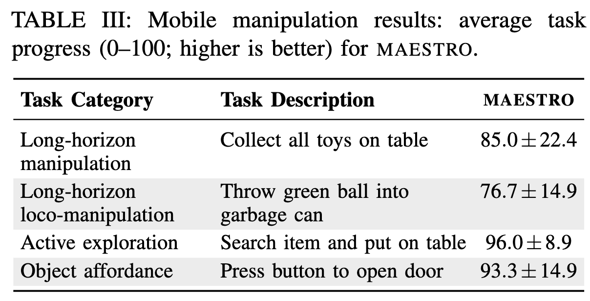 For mobile manipulation, Maestro successfully executes complex, long-horizon tasks across four challenge axes. Performance on long-horizon tasks is bolstered by a cached semantic map for persistent object tracking, though failures occasionally occur due to low-level issues like inaccurate depth or invalid grasp poses. In contrast, active exploration and object affordance reasoning benefit greatly from multi-view replanning and precise keypoint selection, leading to high success rates.
