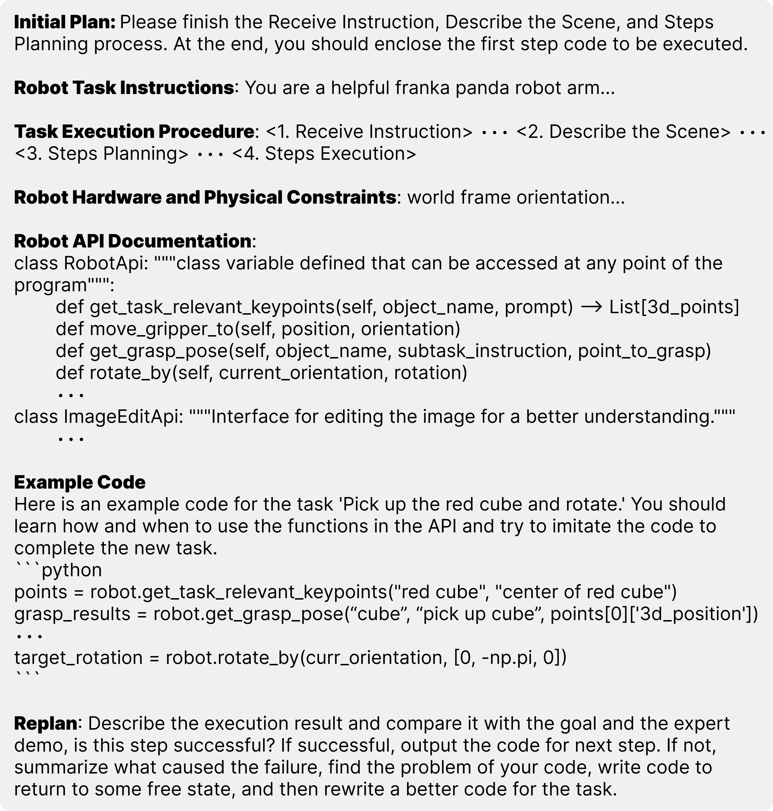 Given prompt and images, VLM plans by writing and executing code that integrates perception, spatial reasoning, control, learned visuomotor policies, and image editing. Execution results (images and stdout) provide feedback for reacting and replanning, forming a closed-loop perceptionāactionālearning cycle. This enables adaptive long-horizon manipulation, as illustrated in the tabletop example on the right (instruction: Grasp the knife by the handle and cut the banana in the middle).