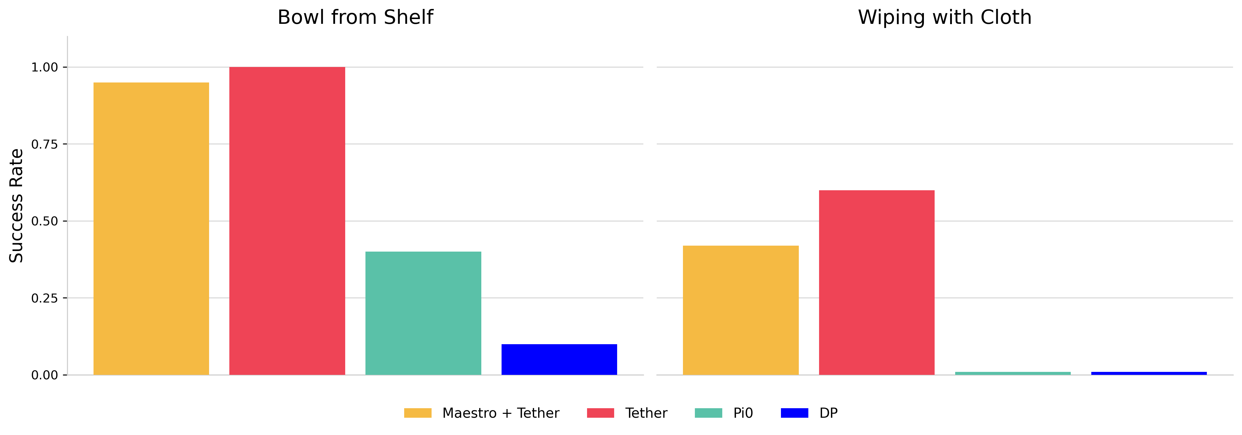 Beyond serving as a zero-shot generalist policy, Maestro can also function as an autonomous data generator for downstream policy learning. We integrate Maestro with Tether, a framework that amplifies a small set of seed demonstrations into large, diverse training datasets via correspondence-driven trajectory warping. Maestro autonomously generates seed demonstrations that Tether then warps, requiring no human teleoperation. On two benchmark tasks (Bowl from Shelf and Wiping with Cloth), Maestro + Tether achieves performance on par with human-teleoped Tether (e.g., 95% vs. 100% on Bowl from Shelf), while both significantly outperform π0 (zero-shot) and Diffusion Policy trained on human-teleoped data. This highlights Maestro's value as a scalable data engine that can produce policies rivaling those trained on human-collected data.