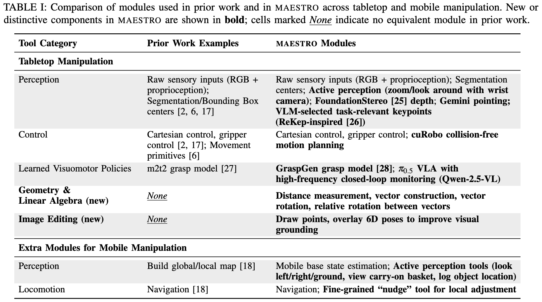 For mobile tasks, the toolset is expanded to include robust state estimation (using LiDARāInertial Odometry), active perception (e.g., look around, remember object location), and dual-mode locomotion (global navigation and fine-grained nudging). This enables the agent to successfully execute multi-stage, long-horizon tasks, such as transport and exploration, across large workspaces. By effectively programming and coordinating these diverse, high-quality modules, Maestro successfully fuses the semantic intelligence of VLMs with the precision of specialized roboticsāa combination essential for achieving superior zero-shot generalization.